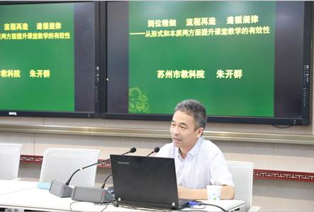随后,大家听取了江苏省特级教师,苏州市教育科学研究院朱开群副院长《从形式和本质两方面提升课堂教学的效益》的讲座。朱院长围绕如何“提升课堂教学的效益”讲了三个要点:管理到位精细、课堂流程的再造,遵循本质规律。讲座内容丰富,案例点评到位,剖析现状准确,指导富有启迪,与会教师深受教益。
