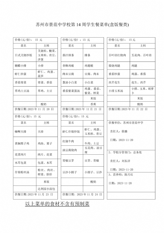 苏州市景范中学校第14周学生餐菜单(盒饭餐类)