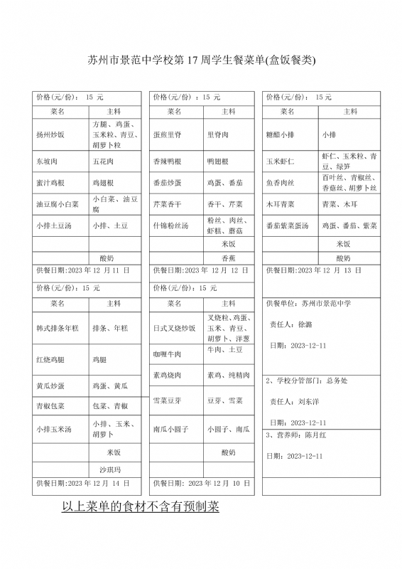 苏州市景范中学校第17周学生餐菜单(盒饭餐类)