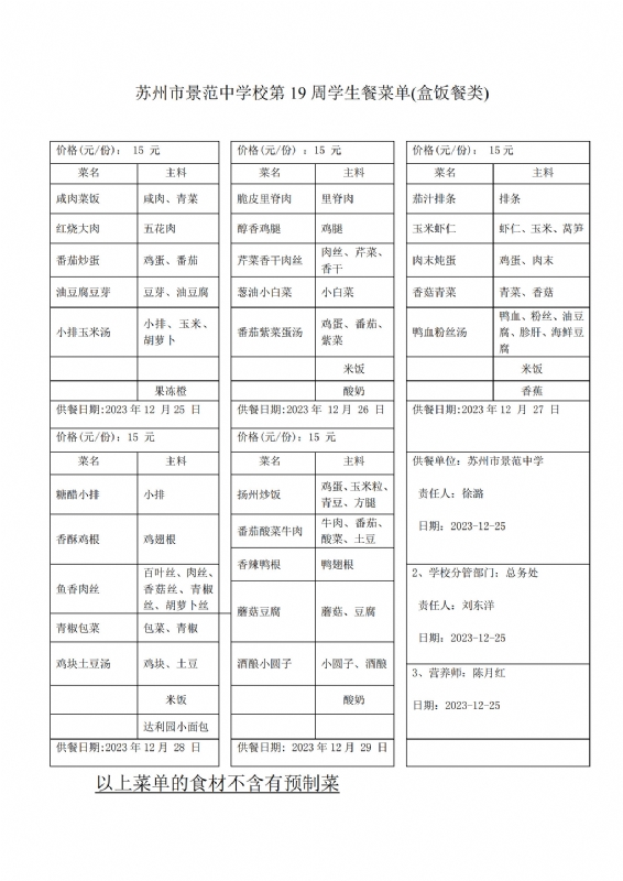 苏州市景范中学校第19周学生餐菜单(盒饭餐类)