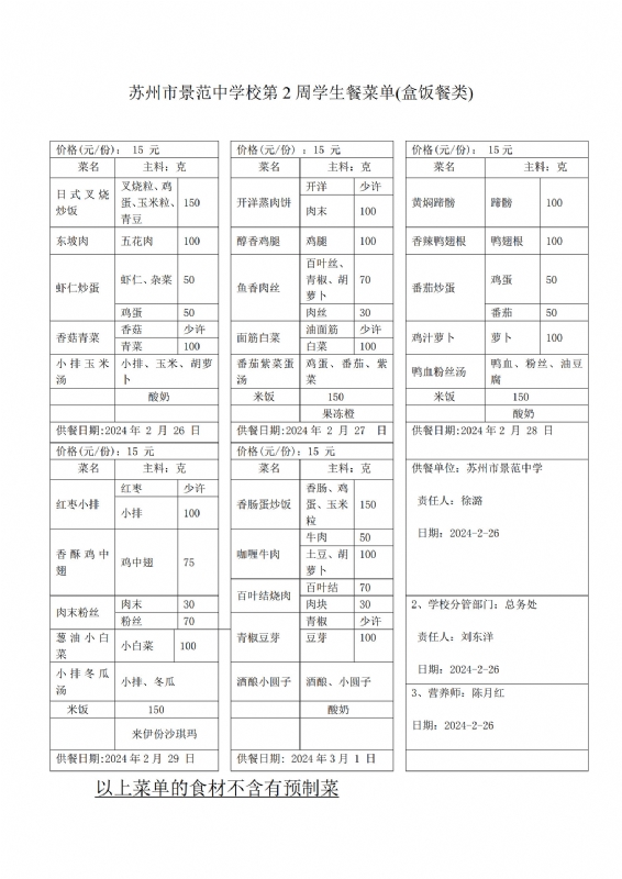 苏州市景范中学校第2周学生餐菜单(盒饭餐类)