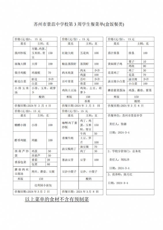 苏州市景范中学校第3周学生餐菜单(盒饭餐类)
