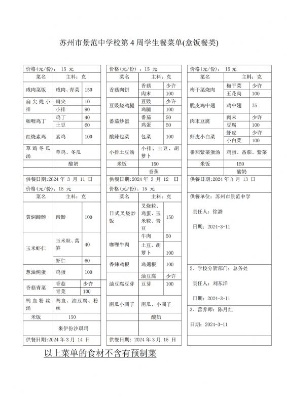 苏州市景范中学校第4周学生餐菜单(盒饭餐类)
