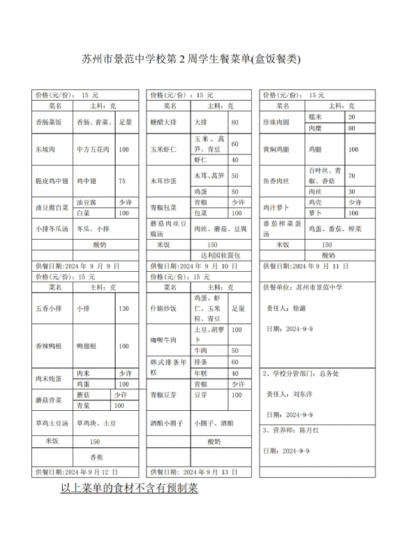 苏州市景范中学校第2周学生餐菜单(盒饭餐类)