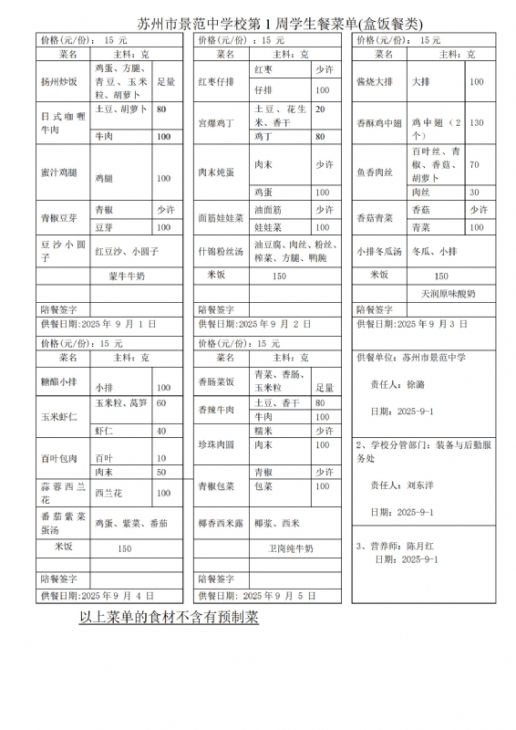 苏州市景范中学校第1周学生餐菜单(盒饭餐类)