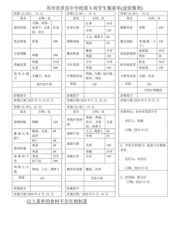 苏州市景范中学校第3周学生餐菜单(盒饭餐类)