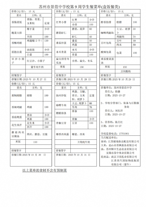 苏州市景范中学校第9周学生餐菜单(盒饭餐类)