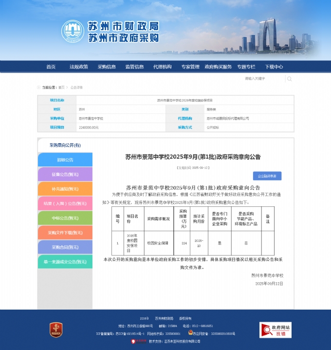 苏州市景范中学校2025年9月(第1批)政府采购意向公告
