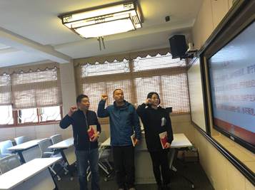首先由沈宗健校长向他们赠送了生日贺卡和礼物(书籍:《红色基因代代传》),然后党员们面向鲜红的党旗,响亮的宣读入党誓词,台下的党员们也都情不自禁的跟着一起重温誓言。最后华建敏同志作为代表做了情真意切的发言,现场气氛严肃而庄重。