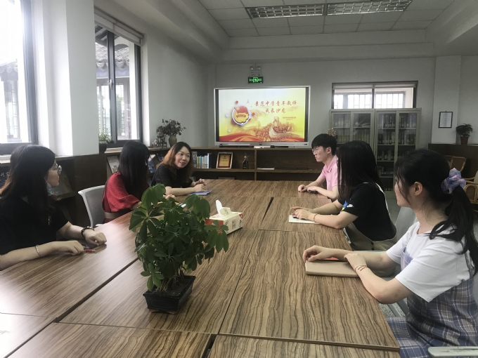 第四项议程:党建带团建,团建促党建。2020年7月7日,苏州市景范中学校教师团支部在“海棠花红”先锋阵地开展了七月初心课堂活动,这是学校团队建设的内容之一,党委任颖书记和全体团员教师参加了本次活动。年轻的团员教师们分享交流了自己这一阶段的教育教学情况,年轻教师容易与学生建立感情基础,充分调动学生学习的积极性,初入职场有收获也有困惑,大家相互交流,彼此点评,相互促进,彼此激励,时刻牢记自己的教育初心,为了今后长足的进步。学校党委坚持党建带团建,团建促党建,努力形成党团互促互进共同发展的良好局面。思想建设是党的建设的重要组成部分,也是团的建设的首要任务。此次初心课堂的成长分享活动就是把青年教师的思想政治建设放在首位,通过引导团员教师,倾听青年呼声,引领青年风尚,把团支部的力量充分发挥出来,更好地投入到将来的教育教学中去,为景范教育高位发展添砖加瓦。