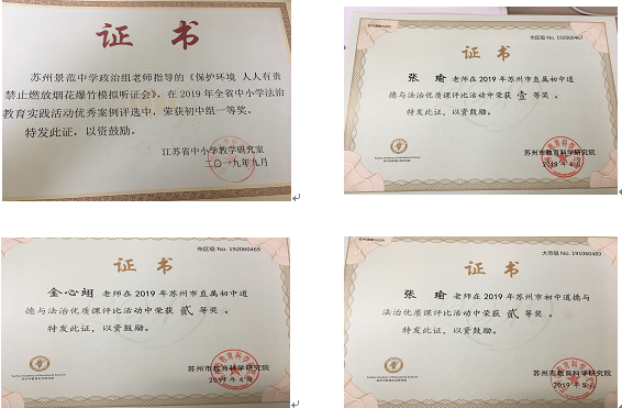 收获成功的喜悦,是秋天最美的一道风景,景范中学政治组在这金秋十月,硕果累累。政治组老师指导的《保护环境 人人有责 禁止燃放烟花爆竹模拟听证会》,在2019年全省中小学法治教育实践活动优秀案例评选中,荣获初中组一等奖。政治组张瑜老师在2019年初中直属道德与法治优质课评比中荣获一等奖,在苏州市法治优质课评比中荣获二等奖;金心翊老师在2019年初中直属道德与法治优质课评比中荣获二等奖。秋天的硕果属于春天的耕耘者,我们将不忘初心、砥砺前行!