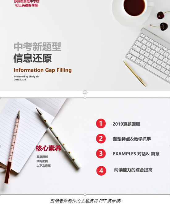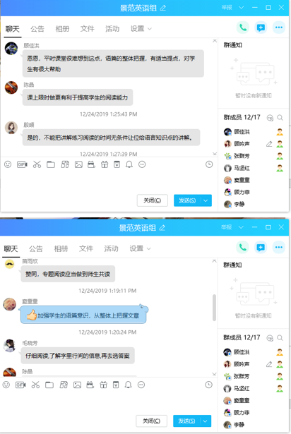 基于上学期初三备课组的教学研究主题,本次主题教研活动由初三英语备课组长殷頔老师主讲。鉴于学期期末工作比较紧张,还有部分教师在校外参加教研活动,所以为了提高教研效率,教研组进行了一次革新,采用了网络教研的方式。