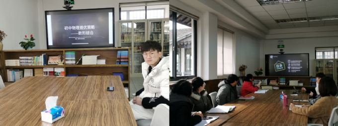 2021.1.7景范物理组成员在阅览室开展了主题教研活动,本次活动主讲人是贺梦成老师。贺梦成老师介绍了初中物理提优策略——数形结合,分别从利用函数图像解决测量仪器刻度是否均匀问题,利用函数关系画出物理量之间的关系图像,利用函数表达式分析图像内所蕴含的物理条件,利用函数图像解决电学最值问题这四方面结合例题进行了分享。