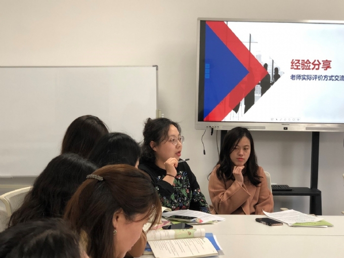 初二备课组长顾佳洪老师给大家分享了她上写作课时让学生自主评价的一些方法,并指:出无论是课上还是课后的评价,要给学生一定的范例,如让学生在课上评价一个作文的sample。此外,评价标准还是要参考《课标》。