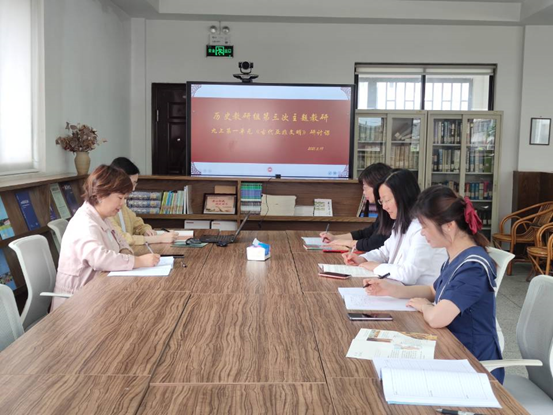 5月19日上午第二节课,历史组在阅览室进行以“古代亚非文明”为主题的教研活动。在中考的新形势下,世界古代史也占有举足轻重的地位,如何让学生事半功倍地掌握主干知识,是教师们不断探索的问题。历史组潘老师作为主讲人给大家分享了自己的备课PPT,分地理环境、政治发展和文明象征三个部分介绍古代亚非文明。随后,大家展开热烈讨论,给出了中肯的建议,蒋老师提议要充分运用世界地图,提升学生的读图能力,苏老师建议课件最后要有各文明之间的对比,最好用表格的形式来梳理知识点,谢老师则强调在世界史的讲解过程中要与中国史相联系,帮助学生构建全球史观。