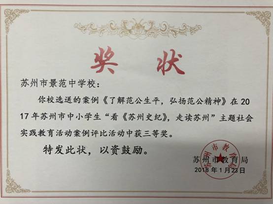 在2017年苏州市中小学生“看《苏州史纪》,走读苏州”主题社会实践教育活动案例评比活动中,苏州市景范中学校选送的案例《了解范公生平,弘扬范公精神》获得苏州大市三等奖。